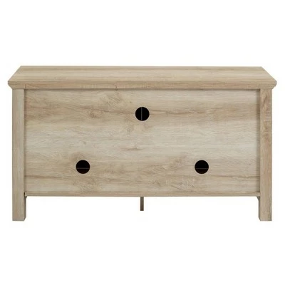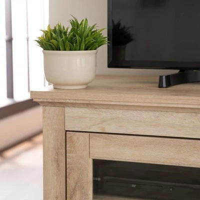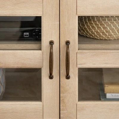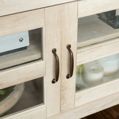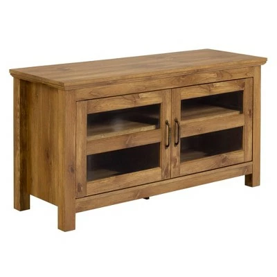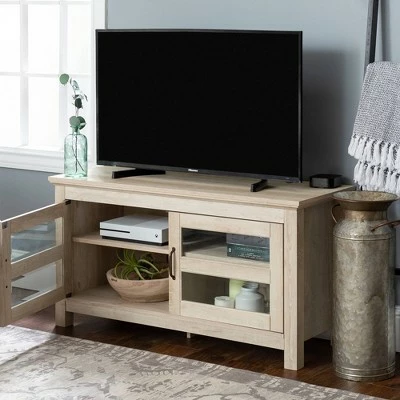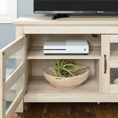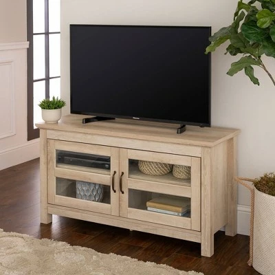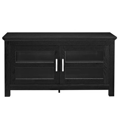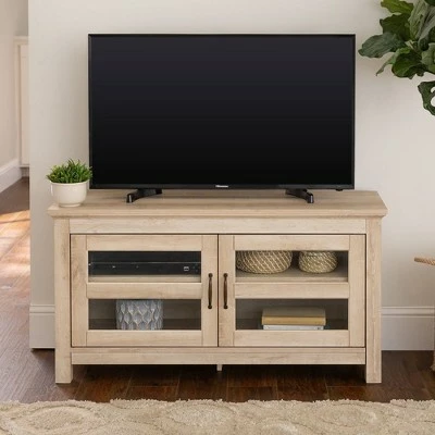 Bring style, function, and clutter elimination in one unit with a 44″ Wood TV Media Stand Storage Console from Saracina Home. The cable management system keeps clunky cords hidden while keeping video game consoles, players, and more plugged in and ready for use. The double doors feature tempered glass and ample storage space on two shelves to help eliminate clutter, keeping your entertainment area looking neat.
