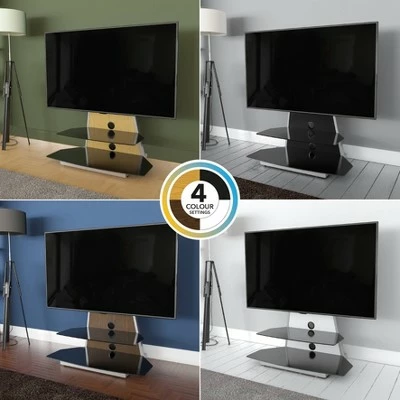 AVF STKL900A-A TV stand is sleek, stylish, and ready to assemble, and thanks to its four included color panels, will complement any décor. It has an integral TV mount with tilt and swivel, and will support TVs up to 90” and 99 lbs. The shelves are black tempered glass for safety and style, and can each hold up to 22 lbs. of AV gear, décor items, books, etc. Wires can be routed through the rear panel for an uncluttered appearance. This TV stand has three height setting to deliver the perfect viewing height, angle of the TV, and optimal esthetics. As noted, it includes four color choices all included in the box. The vertical panel facing forward is color changeable. The four included colors are: White, Black, Oak, and Walnut. Choose which color to highlight when the stand is assembled. Later if it is decided that another color is preferred, simply disassemble a few parts, and swap the color panels for the new, preferred color. All pieces are used in the assembly of this stand, so there is no need to find a storage location for unused color panels. Assembly is simple, and all hardware is included, but as always, it is best to have a helper due to size and weight of some components. This stand accommodates most TVs in these sizes: 37, 39, 40, 42, 43, 46, 47, 50, 52, 54, 55, 58, 60, 65, 70, 75, 80, 82, 86, 88, 90.