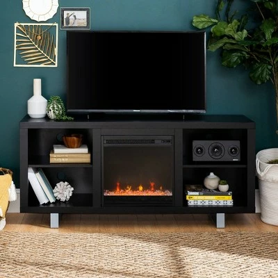 Bask in the ambiance of this Modern Fireplace TV Console from Saracina Home. This sophisticated and simple TV console features four open shelves so you can keep clutter at a minimum while storing movies, books, video games and more. The electric fireplace needs no venting and emits 4600 BTUs of heat to keep you cozy.