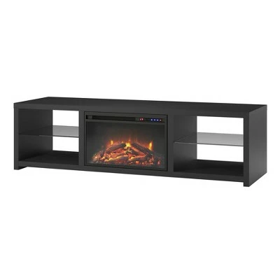 Give your living room a modern update with the Room & Joy Bryan Fireplace TV Stand. The Stand can accommodate a flat screen TV up to 70″ wide or 120lbs. The sturdy hollow core frame is finished in a black laminate that pairs with the tempered glass shelves for a modern style. The 23″ fireplace insert heats a room up to 400 sq. ft. and can be controlled using the remote or touch panel. Various flame and temperature settings gives you the perfect ambiance and temperature for your room. The 4 open shelves provide proper air circulation to prevent your video components from overheating and allows easy access to outlets. Complete your living room with other items from Room & Joy (each sold separately). The Stand ships flat to your door and 2 adults are recommended to assemble. The Stand can accommodate a TV up to 70″ wide or 120lbs. Each shelf can hold up to 20lbs. Assembled dimensions: 18.3″H x 64.1″W x 20″D. The Manufacturer warrants this product to be free from defects and agrees to remedy any such defect. This warranty covers one year from the date of original purchase