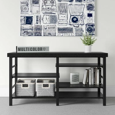 Organize your entertainment space or media room with the Adjustable Storage Media Stand from Room Essentials™. Standing atop a metal frame for durability and lasting use, this media console features adjustable shelves that give you flexible and customized options to store and display your media, electronics or books with ease, while the sturdy tabletop provides a base for placing framed photographs, succulents or other decorative items. Showcasing a matte black finish with an open design and sleek lines, this decorative media stand fills your space with contemporary and modern flair.