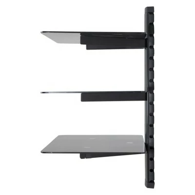 The AS300-A is an A/V wall shelf unit with three shelves. It’s great for a cable box, satellite box, DVR, Blu Ray, DVD, video game consoles, routers, speakers, Sonos devices, other audio devices, or even your prized thimble collection (for example). The AS300-A shelving unit not only saves valuable space, but it also safely secures your AV equipment to the wall. Installation is quick and easy. The height-adjustable black tempered glass shelves measure: 14.96 inch (width) x 11.02 inch (depth), and supports up to 22lbs each.