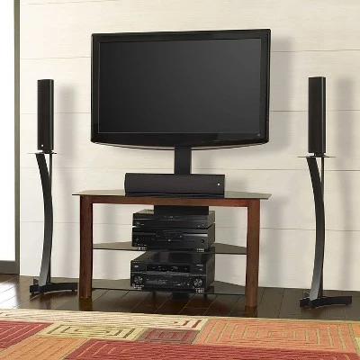 This modern and versatile design offers three configuration options to meet your display and room layout. It can accommodate most Flat Panel TVs up to 55 inches or 125 lbs. and at least 4 audio/video components. The rear mounting frame and universal swivel mounting system can be removed so that the system can be used as a 3-shelf stand-alone table. Or the swivel mounting pole can be removed and the TV can be hung on the included swivel wall mount. It features a hand painted Dark Cherry finished wood look frame with black tempered safety glass shelves and black scratch resistant powder-coated metal. The open architecture provides superior ventilation and includes an integrated CMS Cable Management System to hide and organize unsightly wires and interconnect cables.