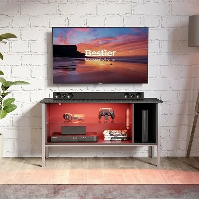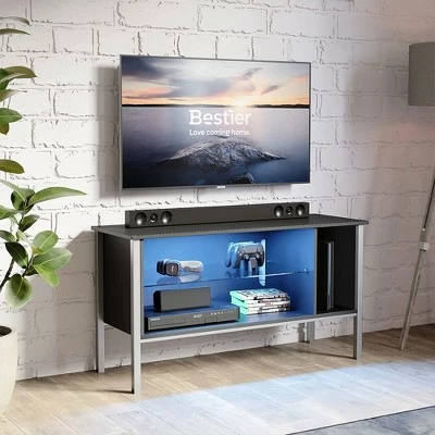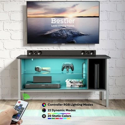 Bring your entertainment setup into the 21st century with a modern, sleek design and user customization. If you want an entertainment center that can set or match the mood, the 44-Inch TV Stand from Bestier is the one for you.For an immersive gaming or viewing experience, you can change the lighting between 7 colors and 20 display modes via the included remote control. House your belongings in the 3 compartments with a tempered glass shelf for your storage and entertainment needs. This cabinet is great for storing anything from stereos, DVDs, routers, gaming consoles, electronics, books, magazines, controllers, and anything else. You can also hide wires and cables in the back cord hole.With a textured surface made from P2 board, you get a waterproof, heat resistant, and anti-scratching tabletop. The metal table legs provide a sturdy and stable base so you can feel confident storing your expensive electronics. Level up video games, movies, live sports, or TV in your living room, bedroom, den, or man cave, with the 44-Inch TV Stand from Bestier.