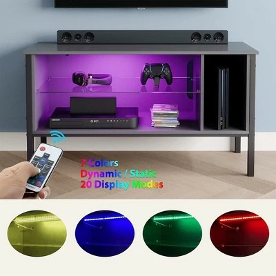 Bring your entertainment setup into the 21st century with a modern, sleek design and user customization. If you want an entertainment center that can set or match the mood, the 44-Inch TV Stand from Bestier is the one for you.For an immersive gaming or viewing experience, you can change the lighting between 7 colors and 20 display modes via the included remote control. House your belongings in the 3 compartments with a tempered glass shelf for your storage and entertainment needs. This cabinet is great for storing anything from stereos, DVDs, routers, gaming consoles, electronics, books, magazines, controllers, and anything else. You can also hide wires and cables in the back cord hole.With a textured surface made from P2 board, you get a waterproof, heat resistant, and anti-scratching tabletop. The metal table legs provide a sturdy and stable base so you can feel confident storing your expensive electronics. Level up video games, movies, live sports, or TV in your living room, bedroom, den, or man cave, with the 44-Inch TV Stand from Bestier.