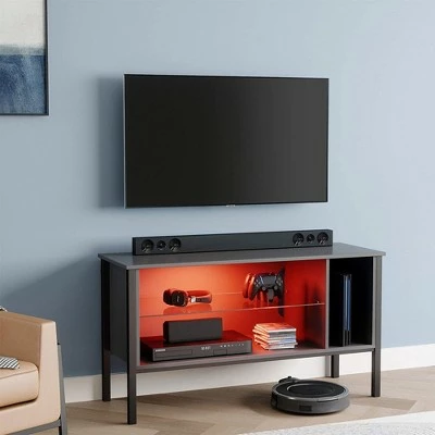 - SLEEK DESIGN: Modern TV stand offers adaptable lighting and adequate storage space to turn your living room, bedroom, or den into an immersive gaming or viewing experience; Color: Dark Grey