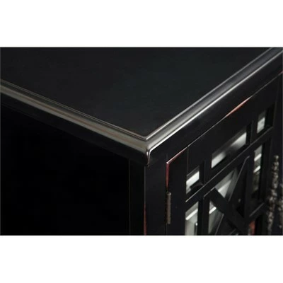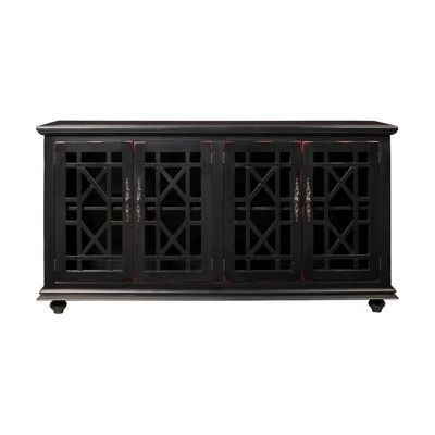The Cassandra TV Stand features a beautiful Antique Black finish with sophisticated transitional styling inspired by design cues taken from Parisian antique markets. Elegant trellis details on the glass doors, intricately cast door pulls, turned bun feet, and architectural moldings are all blended together for an exquisite look. Each piece is slightly distressed with just the right amount of rub through at the edges to make it seem like this was a piece handed down through generations. The versatile design allows the piece to be used as an Entertainment Console, an Entry Hall Credenza, or as a Dining Room Server. Removable and adjustable shelves provide versatile storage options for audio, video, gaming components. Vertical wire management cutouts allow for easy access with multiple shelf configurations. Ideal for 65” Flat Panel TVs. ETA (Easy To Assemble). Anti-tip kit added for safety. Assembled Dimensions: 63″ W x 35″ H x 18″ D.Features : Finish: Antique BlackTwo (2) large cabinets feature tempered glass doors with an elegant trellis design allowing for plenty of storage for TV, audio, and video game component storageDesign features include slightly distressed finish, intricately cast door pulls, turned bun feet, and architectural moldingsVersatile design allows the piece to be used as an Entertainment Console, an Entry Hall Credenza, or as a Dining Room ServerTwo (2) Large adjustable shelves allow for multiple storage optionsIdeal for most 65″ flat panel TVsSpecifications : Product Dimensions : 63″ W x 35″ H x 19″ DNumber of Shelves : 2Assembly Required : Yes, Features the Lightning Fast Assembly System
