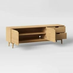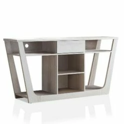 This two-toned TV stand is versatile with its transitional style. It presents itself with a rustic white and dark gray finish. Its darker open base features three open compartments perfect for media components, storage, and display. On top, three light and bright drawers create a spot to stash everything from games to accessories. This lends a balanced look with smooth functionality.