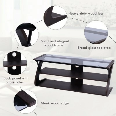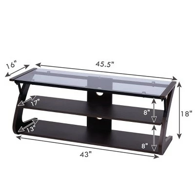 This is our brand new contemporary TV stand, which is a compact and functional entertainment center with an open shelf structure. Constructed with tempered glass, engineered particleboards and powder-coated steel, this TV stand is durable and sturdy. It features two bottom shelves, which offers ample space for your media components like DVD player, CDs, or books, magazines or any decorative items. Plus, Two circular cable holes on the back keep the power cord and other cables organized. Don’t hesitate to take it home! Specification: Material:Tempered Glass + MDF +PVC +Steel. Product size: 45.5″L x 16″W x 18″H. Size of the middle shelf: 43″L x 17″W. Size of the bottom shelf: 43″L x 13″W. Recommended maximum weight: approx 66 Lbs. Package includes:1 x TV Stand;1 x Instruction. .