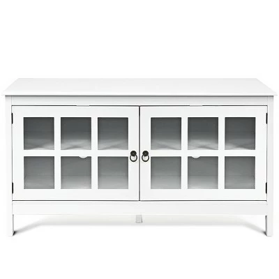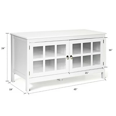 This is our brand new modern TV stand, which brings a dramatic contemporary styling to your home with its elegant finish. The top can support TVs up to 50 inches, and the 4 shelves help you storage necessary media or gaming devices. Our TV stand is more than a TV stand, it is a piece of furniture for your home. With a clean edged top, rectangular legs, delicate glass, and classic circular handles, our distinctive TV stand creates a warm and charming atmosphere for your home or office. This TV Stand is designed to blend into a variety of living and family room settings. With its casual contemporary style, this exquisite collection is a relaxed look that fits anywhere. Do you want this beautiful TV stand? Just buy it now!. Specification: Color: White. Material: wood+ glass. Overall Size: 45” x 19” x 24”(L x W x H). Weight: 59.3 Lbs. Capacity Weight: 44 Lbs. Package includes: 1 x TV stand, 1 x instruction. .