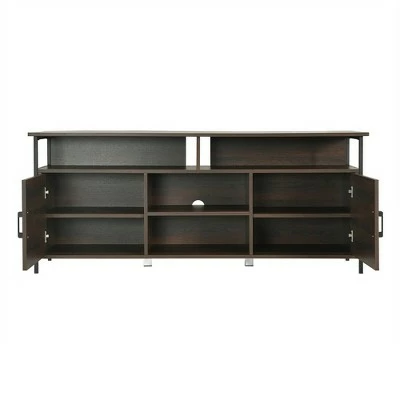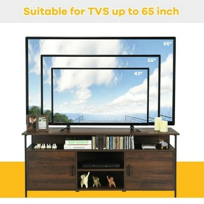 Our TV stand is the perfect solution for increasing storage space in your home. The multifunctional cabinet can be used as a TV stand for placing a TV up to 65”, and can also as a side cabinet to display desired items to show your own aesthetics. The open storage cubby doesn’t block the sight and make it easy to carry items. The storage cabinet with doors can block dust and features 3 height-adjustable shelves. Equipped with 2 extra legs at the center, the 65” entertainment center will increase stability and improve load-bearing capacity. Besides, these cable managements are convenient for the arrangement of routers, audio and other data lines. Specification: Color: Walnut. Material: Iron, Engineered Wood. Product Dimension: 58” x 17.5” x 24” (L x W x H). Net Weight: 91.5 lbs. Maximum Weight of Tabletop: 110 lbs. Maximum Weight of Shelf: 22 lbs. Package Includes:. 1 x TV Stand. 1 x Instruction.