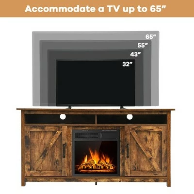 Our rustic style fireplace TV stand is the modern representation of mid-century furniture, perfect for any room looking to add a bit of retro-style flair, included a 750W/1500W Electric Fireplace, you can see the lifelike flames and burning logs, it will warm up your room and create a romantic atmosphere. the spacious tabletop can hold a TV up to 65” and some decorations. Open shelves, compartments and two side cabinets provide ample storage space for your books, gaming devices, audio and visual equipment. If you are looking for a piece of furniture that combines aesthetics and practicality to improve your quality of life, then this TV stand should not be missed! . NOTE:There are 2 boxes and one box is for Electric fireplace, another one is mantel. We ship 2 boxes via FedEx or UPS on same day, but they will arrive on different days. Don’t worry and thanks for your understanding. Specification: Color: Brown. Material: P2 Engineered Wood. Product Dimensions of TV Stand: 58” x 16” x 29” (L x W x H) . Product Dimensions of Fireplace: 18” x 17.5” x 10” (L x W x H) . Voltage: 120 V, 60 HZ. Power: 750 W/ 1500 W. Heat Output: 50,000 BTU. Heating Area: 400 Square Feet. Net Weight: 79 lbs. Weight Capacity of Top: 100 lbs. Weight Capacity of Each Shelf: 20 lbs. Package includes: . 1 x TV Stand. 1 x Electric Fireplace. 1 x Instruction.