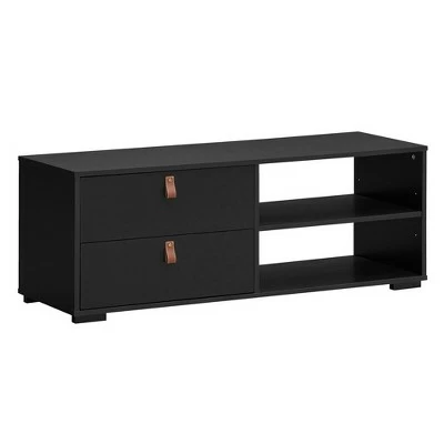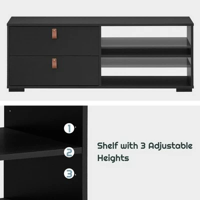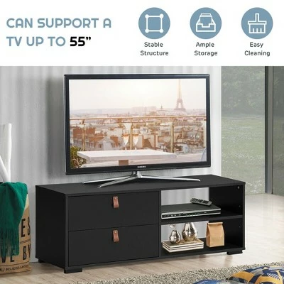 This stylish TV stand will add plenty of storage space and glamour to your home!Made of premium engineered wood, our TV stand is sturdy and durable with a long service life. 5 wide legs ensure excellent stability and the anti-scratch foot pads can protect your floor from damage. The spacious tabletop can support up to 55 inches of TV and some decorations. Two large drawers and adjustable shelf provide ample storage space for your books, audio equipment, snacks, etc. In addition, PVC handles and smooth drawer rail slides allow you to access items with ease. If you are looking for a piece of furniture that combines aesthetics and practicality to improve your quality of life, then this TV stand should not be missed! Specification: Color: Black/Walnut. Material: P2 Engineered Wood. Overall Dimension: 47.5”(L) x 15.5”(W) x 17.5”(H). Net Weight: 57.5 lbs. Weight Capacity of Tabletop: 77 lbs. Weight Capacity of Each Drawer: 11 lbs. Weight Capacity of Each Shelf: 11 lbs. Package includes:. 1 x TV Stand. 1 x Instruction.