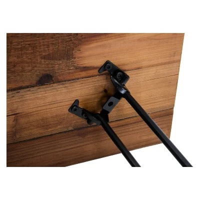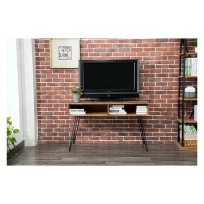- TV console with hairpin legs has a wooden top with 2 open cubbies