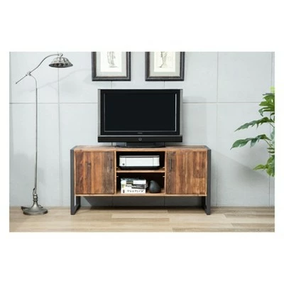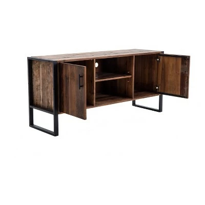 Reclaimed hardwood is offset by a matte metal frame in the Ruffalo 60″ TV Stand from Crawford & Burke for a rustic industrial look that remains timeless and versatile. This wood and metal console table is the perfect addition to any living room that needs a touch of personality, style and organization, with cabinets to keep controllers and games in one place and open shelves to do the same for consoles and cable boxes.