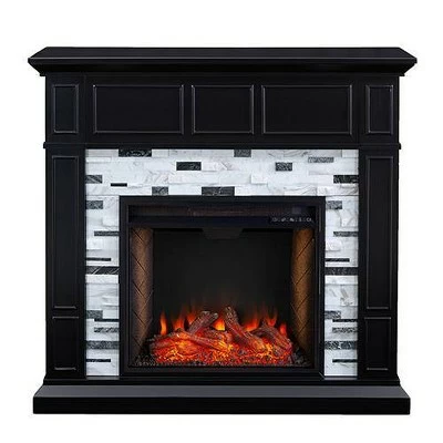 Go bold in black and white with the Aiden Lane Dalmen Marble Fireplace w/ Smart Firebox. A sleek black mantel and real stone surround make this electric fireplace an elegant addition to your home design. Voice-enabled Alexa technology allows for convenient control from anywhere in the room, while flickering LED flames, realistic embers, and faux fire logs add cozy ambiance to your space all year long, with or without heat. Use this faux stone fireplace mantel to heat up your home office, or add to your living room or open concept living space for a stylish centerpiece that fires up your design.