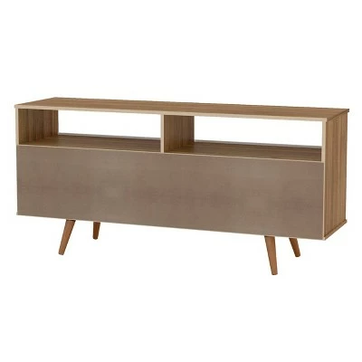 The Danbury TV Stand brings together functionality and style, all the while making the room seem complete. With a single door that opens and closes via a hydraulic arm, all your media items are out of sight. This sleek looking media console has all the storage space you might need, and also holds up to a 60-inch TV for all your entertainment needs. Its round, modern wood legs add a touch of class.