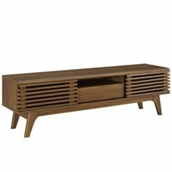 Encourage mid-century modern design in your living space with the Daxton 43″ TV Stand. Sleek lines, splayed legs, gold metal hardware, and contrasting tones create a striking piece for your living room, bedroom, lounge room, or home office. Made with particleboard, MDF, and beautiful wood grain paper lamination, Daxton features ample storage space with an adjustable center shelf and two storage areas behind solid white doors. Cable management holes make this entertainment console ideal for keeping all your media essentials organized. A versatile addition, this television stand can accommodate TV’s up to 46″ and also serves as a display stand for home accessories, decor, and more. Includes non-marking foot pads.