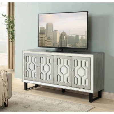 Eclectic style with a dash of charismatic glamour, our Four Door Media Credenza takes center stage! Finished is a Bose Metallic Pewter, this credenza features a grooved design that rises up the sides and across the top, mesmerizing overlays on the mirrored door fronts, faceted crystal hardware, and dark metal legs that hold it all aloft. A class act to enhance your entry, entertainment area, or dining room with impeccable style.