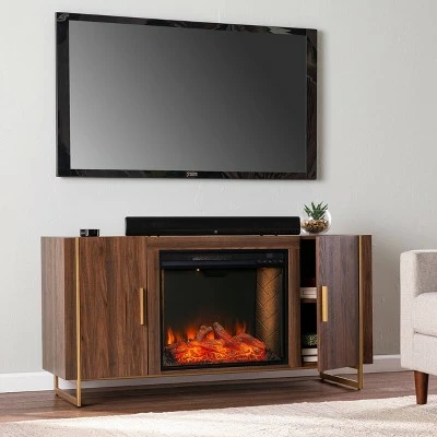 Sophisticated style comes home with the Aiden Lane Farnsmet Smart Fireplace with Media Storage. Adjustable shelves neatly tuck away spare cords or your favorite movies, while sleek cabinet doors feature unique gold accents for a bold pop of color. Flickering LED flames and voice-controlled settings modernize your fireplace experience, working with or without the heater for cozy ambiance in any season. Put the finishing touch on your contemporary design with this two-tone electric fireplace.