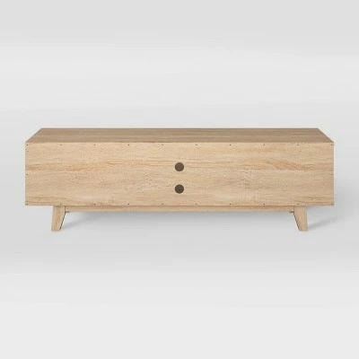 Take your living room to the next level with this stylish modern TV stand. Comprised of two contrasting cupboards, and an open shelf for a sleek yet classic appearance. This entertainment center creates additional storage space in your home for media, electronics, accessories, books, or decor. The beautiful wood finish with contrasting white doors paired with modern flared legs looks great in any aesthetic. This bench fits most TVs up to 68″ and is the perfect combo of classic colors and finishes.