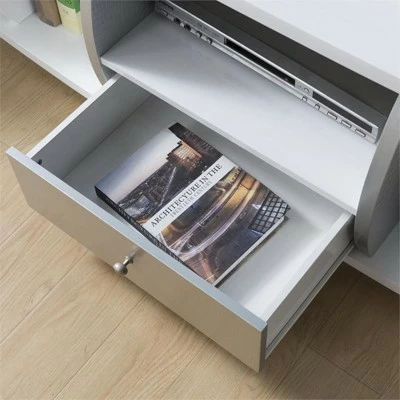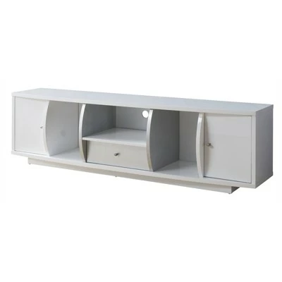 Update the TV or game room with this 72-inch contemporary wood TV stand from the Gather collection. Curved shelf dividers and a glossy white finish with crocodile patterned panels create a sleek contemporary aesthetic, while a multitude of storage options provides practical solutions for keeping the family room organized.Features : CONVENIENT CABLE MANAGEMENT – 1 cut-out hole in the back for cable placementIncludes: One (1) TV StandStyle: ContemporaryFinish: WhiteMaterials: Particle Board, MDF, Steel HardwareCentral drawer with metal glidesThree (3) open shelf spacesRear opening for wire managementTwo (2) storage cabinets, each with a shelf insideEasy to follow step by step assembly guide includedSpecifications : Product Dimensions : 72″W x 16.75″D x 19.25″HProduct Weight : 86 lbsWeight Capacity : 100 lbsAssembly Required : YesWarranty Description : 90-Day Manufacture Limited Replacement Parts Warranty