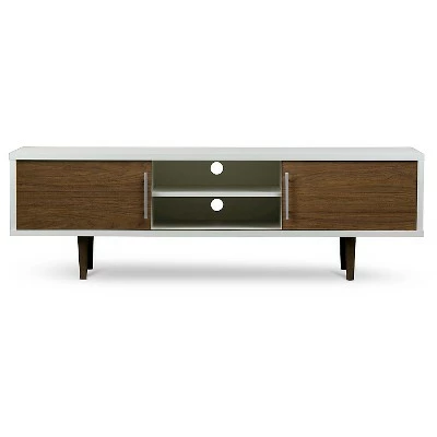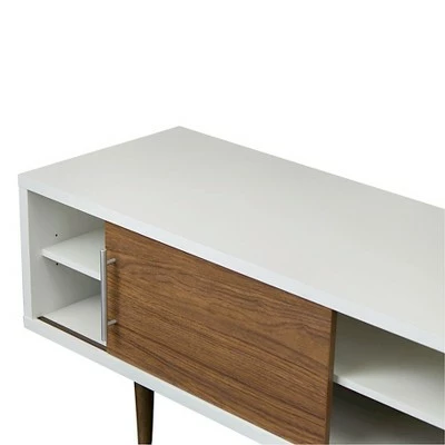 Twin tones intertwine intensely in our Gemini Wood Contemporary TV Stand. Boasting a compellingly contrasting white-and-walnut faux wood-grain paper veneer, this TV stand brings sensational styling to your entertainment center. Genuine metal sliding-door pulls and tapered black legs create a dynamic presence at a discount price. Dimensions: 20.5″ High x 66″ Wide x 17.75″ Long; Left& Right Cabinet: 11.1″ High x 20.75″ Wide x 16″ Deep; Middle shelves: 5.25″ High x 21″ Wide x 15.75″ Deep