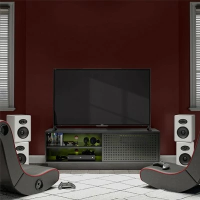 Go from n00b to true gamer with the NTense Glitch Gaming TV Stand. This TV Stand can hold most flat screen TVs up to 60” wide or up to 95 lbs. Made of painted MDF with a powder-coated metal sliding door, the finish pairs with the glass middle shelf and RGB lights for a contemporary look. The metal sliding door creates both open and concealed shelves that still provides proper air circulation for all of your equipment and features wire management to keep your cords organized. The glass middle shelf and LED lighting are perfect for any gamer ready to take it to the next level. The TV Stand ships flat to your door and 2 adults are recommended to assemble. The TV Stand can hold up to 95 lbs. Each shelf can hold 25 lbs.