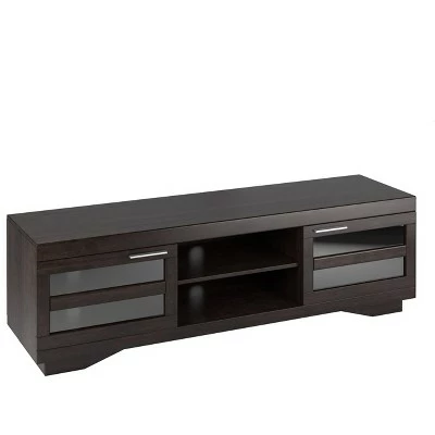 Add a sleek contemporary look to your home theater display with this new extra wide TV bench. Sliding tempered glass doors framed with solid wood offer the perfect stage for up to an 85″ TV while providing the ideal space to safely conceal your components and accessories. Brushed aluminum hardware and spacious open shelves make this extra wide design the perfect way to sit down and enjoy your flat screen TV and home entertainment system. Maximize your living room or entertainment space with the versatility of both open and closed storage.