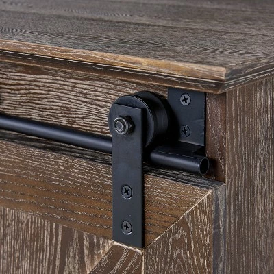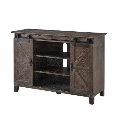 Farmhouse style moves in with the Aiden Lane Halgo Barn Door TV Stand. Ample shelving creates enough room to store all your electronics, media consoles, or books while working barn doors slide to conceal and reveal as you desire. Snag the country look with this rustic TV stand in the living room or den.