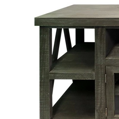 Bringing the best of design and function together, this rustic style TV console is a perfect addition to your home. Handcrafted from wood with distressed gray finish, this TV stand features an open compartment with cable cutout and two glass door cabinet with an interior shelving unit to keep your media accessories in an organized manner. The four side shelves with inverted V shape sides, offering display space. Due to the handcrafted nature of the product, there may be variation in color, finish, wood grain and knots.