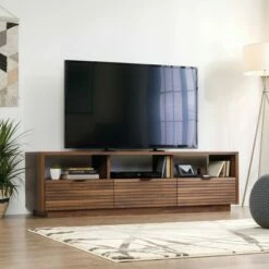 As fashionable as it is functional, this credenza from the Harvey Park collection is a compliment to any room in your home. It accommodates up to a 70″ TV, making it ideal for entertaining friends and family or watching your fave movie on the big screen. It features three open shelves along with three storage drawers that open and close on smooth metal runners. Finish in Grand Walnut, this chic TV stand will be the center of attention in your living room.