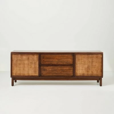Equip your TV unit on this Wood & Cane Transitional Media Console from Hearth & Hand™ with Magnolia. This transitional media console makes a great addition to your entertainment space. It features a clean-lined wooden construction with woven cane details for extra visual flair. The two drawers and two door cabinets with adjustable shelves offer ample storage space for media essentials and other items, and the top shelf provides space for your TV display. Plus, the cord cutout ports keep cables tidy.