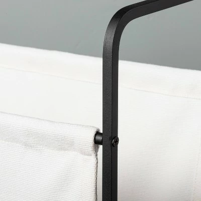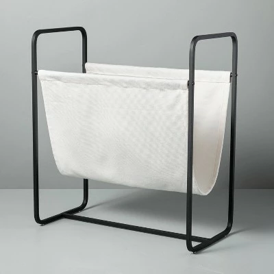 Keep your essentials close by using this Metal & Fabric Storage Rack from Hearth & Handâ„¢ with Magnolia. Supported by a black metal frame, this white fabric storage rack adds modern charm to your decor. Whether you’re using this storage rack to hold your magazines, blankets or any other item, this ground freestanding storage rack will help you keep your home organized.