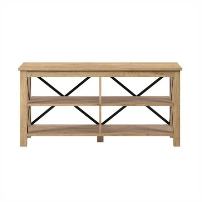 Strong geometric lines set this modern farmhouse-inspired TV stand apart. Its X-shaped black metal accents offset the rich wood tone, creating a warm neutral color palette that will blend seamlessly into any design scheme. A must-have for living areas and entertainment spaces, this TV stand sets the stage for the big game, a movie marathon, or that season finale everyone’s been talking about.Features : Finished in white oak with black metal accents.The top has a weight capacity of 75 lbs. Lower shelves can hold 25 lbs. each.Two lower shelves with 4 distinct compartments.Accommodates most flat-screen TVs up to 50 inches. Made from premium metal and tempered glass this media console can support up to 75 LBS.Premium materials have been used in the making of this productSpecifications : Product Weight : 61.8 lbsFrame Material : Wood