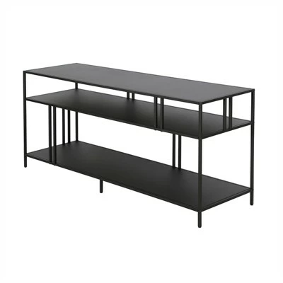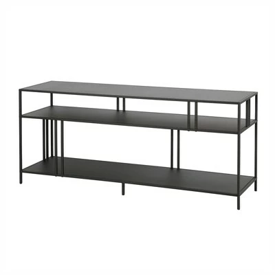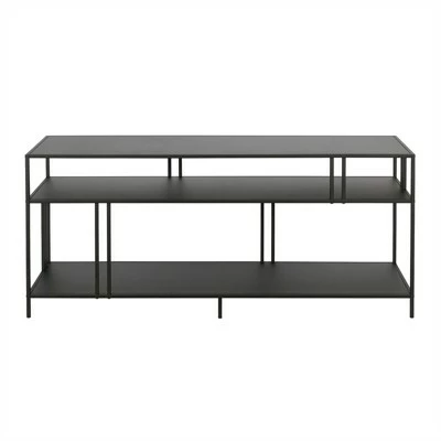 A strong linear profile sets this industrial-inspired TV stand apart. It’s double-barred accents offset the 3 tiers of durable metal shelving, creating an artful backdrop for your media collection or decorative items.Features : Hand crafted blackened bronze finish applied to a steel frameWeight capacity is 75 lbs.Features solid metal shelves.Accommodates most flat-screen TVs up to 55 inches. Made from premium metal and tempered glass this media console can support up to 75 LBS.Premium materials have been used in the making of this productSpecifications : Product Weight : 43 lbsFrame Material : Steel