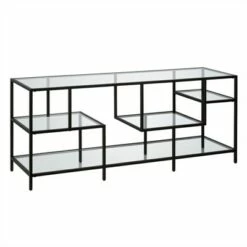 Combine functionality and on-trend design with this sturdy yet fashionable TV stand. Its tempered glass top and shelves are offset by your choice of neutral metallic finishes. Etagere-inspired shelving creates visual interest and provides an artful backdrop for your media collections or decorative items. Go modern in Black Bronze or glam in golden brass to elevate your entertainment space.Features : Accommodates TVs up to 65″Hand crafted Black Bronze finish is applied to the steel frame.Features a tempered glass top and shelves.Weight capacity is 75 lbs. on top, 20 lbs. on middle shelf, and 50 lbs. on bottom shelf.Features easy assembly.Clean with a soft, dry cloth; no harsh chemicals or abrasive cleaning materials.Specifications : Product Weight : 74.10 lbs