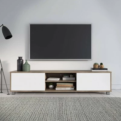 Take your living room to the next level with this stylish modern TV stand. Comprised of two contrasting cupboards, and open shelves for a sleek yet classic appearance. This entertainment center creates additional storage space in your home for media, electronics, accessories, books, or decor. The beautiful wood grain finish with contrasting white doors paired with silver pillar legs looks great in any aesthetic. This bench fits most TVs up to 85″ and is the perfect combo of classic colors and finishes.