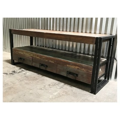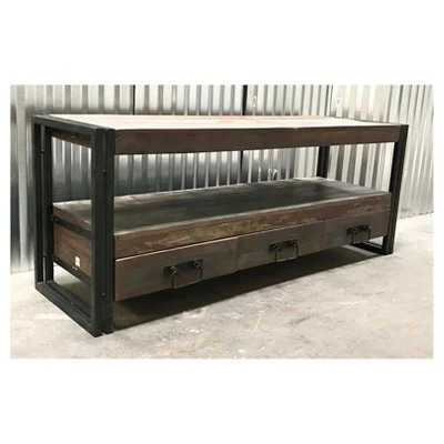 Give your living room a makeover with this Industrial Old Reclaimed Wood and Iron 3 – Drawer 70″ TV Console from Timbergirl. The large lower shelf allows you to display decorations or books, or to keep your electronic components within reach. The reclaimed wood construction highlights the natural beauty of the design, while the solid iron frame makes for durability and long-term use.