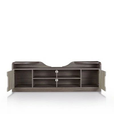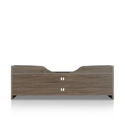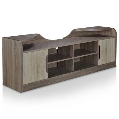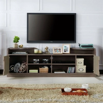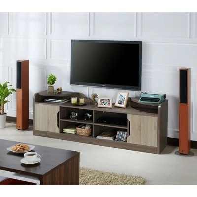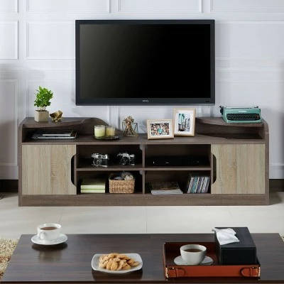 Quirky design delivers a compelling look for a modern space that puts the focus on the beautiful two-tone look of the Ingley TV stand by miBasics. With a chestnut brown and natural oak dual finish palette, it captures attention and offers design versatility. Contrasting cabinets in a lighter finish store items out of sight to keep your space tidy and organized. This 72-inch TV stand has multiple cutouts on the back panel for easy cord access.