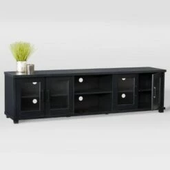 This low profile, classic long TV bench is featured in our rich wood grain finish accented with imitation nickel handles, includes 2 drawers and 2 open center shelves and two cupboards. Offering a variety of open and concealed storage making it the perfect solution for a sleek appearance. This modern bench can accommodate most TVs up to 85″. Easy to assemble and well fitted in any living room or entertainment space
