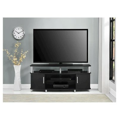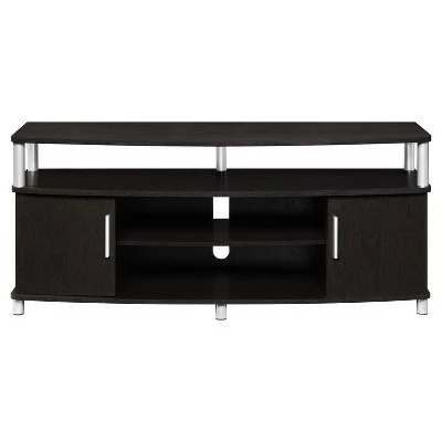 Add a sleek new design to your living room with the Room & Joy Kimmel 50” TV Stand. With both open and closed storage, you’re sure to find a place to stow your electronic and entertainment components. In the open area, there are 2 adjustable shelves and 1 fixed shelf on which you can keep your cable box, gaming console, DVD player and speakers. Behind each of the 2 doors, there is 1 additional adjustable shelf and 1 additional fixed shelf, offering you the space needed to organize your books, games and DVDs. Plus, you can keep your cords organized with the wire management system. The assembled dimensions are 20.5″h x 47.2″w x 15.75″d, which allows the stand to accommodate a flat-screen TV up to 50” with a maximum weight of 60lbs. Multiple finishes are available. Two people are required for proper assembly.