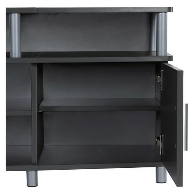 Elevate your entertainment space with the great-looking contemporary Room & Joy Kimmel TV Stand. Designed to accommodate up to a 70″ flat screen TV up to 120lbs., this TV Stand creates a sleek and stylish showcase for your home theater system. The TV Stand features multiple open shelves for numerous audio components. Two side cabinets provide additional concealed space for storing movies, music, video games, gaming controllers and other items. The Carson allows you to run wires easily and neatly through the large wire management holes in the back of the unit to keep all your components tangle free. The clean lines of this TV Stand and the matte black finish with silver metal accents makes this piece stand out in any room. After fully assembled, this stand is 20.5″H x 63″W x 15.75″D and is recommended to be assembled by 2 adults. This TV stand is constructed of particleboard and metal for a look that fits in with modern day style.