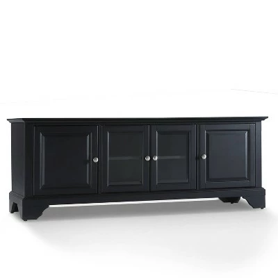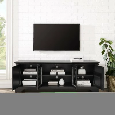 Enhance your living space with Crosley’s impeccably-crafted low profile TV stand. This signature cabinet accommodates most 60″ flat panel TVs, and is handsomely proportioned featuring character-rich details sure to impress. Raised panel doors strategically conceal stacks of CD/DVDs, and various media paraphernalia. Tempered beveled glass doors not only add a touch of class; they protect those valued electronic components, while allowing for complete use of remote controls. Adjustable shelving offers an abundance of versatility to effortlessly organize by design, while cord management tames the unsightly mess of tangled wires. Style, function, and quality make this cabinet a wise choice for your home furnishings needs.