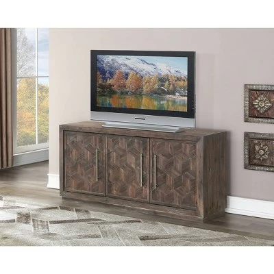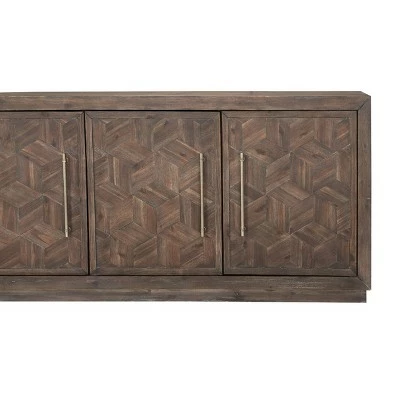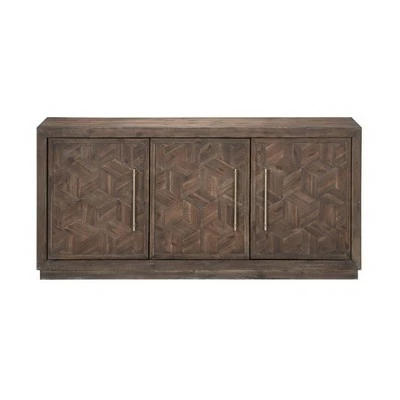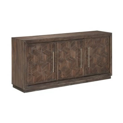 For your dining room, den, or game room, this Media Credenza finished in our Tumbler Dark Brown is sure to be a stand out! Rich wood tones and the clean, straight lines of the body as it floats above the barely there base gives your that stately, classic form, but it is the fronts of the three doors that gives this Credenza that special look that you so adore! Intricately pieced cubes draws your eyes in and out as the variations of the wood tones provide a three dimensional affect. A tantalizing addition for your home!