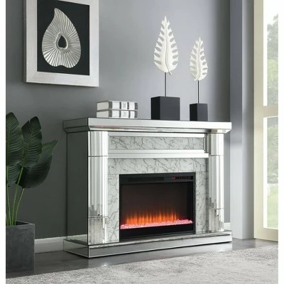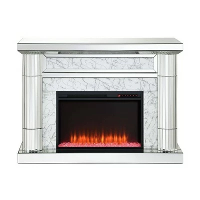 The Picket House Furnishings Lorelei Fireplace adds dimension and style to your space. Finished in silver and surrounded by beautiful faux marble, this fireplace is a for sure statement piece. Carefully designed with metal, engineered woods, and glass, This fireplace is freestanding and secure. Showcases a linear silhouette and glowing beveled mirror, adding a touch of style to whichever room this fireplace will occupy. Provides enough heat to make the room cozy and inviting. Includes a remote control to adjust the temperature to your liking. Ships in two boxes.