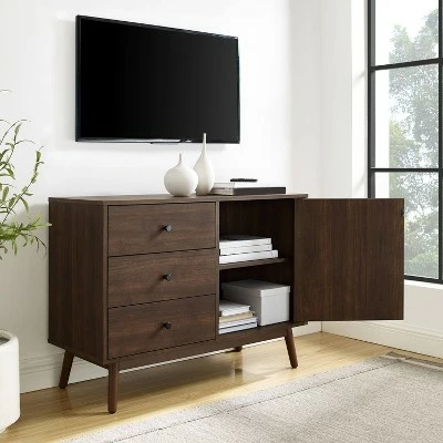 Stay organized in mid-century modern style with the Lucas Media Console. Featuring a large cabinet with an adjustable shelf, you can store everything from books and board games to dishes and flatware. With three large storage drawers, this console keeps smaller items organized and out of sight. The Lucas Media Console has clean lines and a simple design that complement any room in your home.