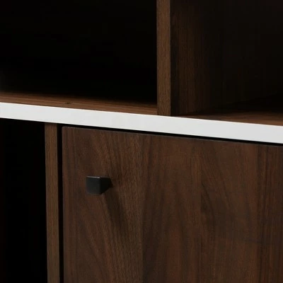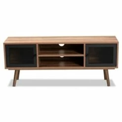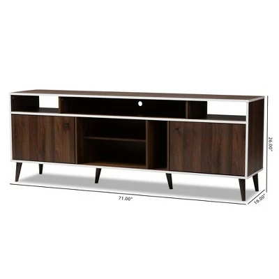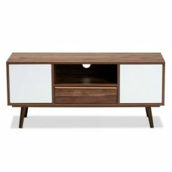 Storage and organization possibilities abound with the Marion TV stand. The modern and contemporary-inspired design of this television stand are clear to see in the use of contrasting colors and angled, tapered legs. The Marion’s engineered wood outer frame is finished in white, while the shelf spaces, doors, and legs are finished in a warm brown. The TV stand features ten shelf spaces, four of which are tucked behind cabinet doors. The back panel of the Marion has circular cut-outs for wire management, making it easy to store and organize your gaming consoles and media players. The arrangement of the shelf spaces opens up the possibilities of storage and decor arrangements, from storing vinyl records to displaying curios. Add trendy, cool vibes to your livingroom or rec room with the Marion. Made in Malaysia, the Marion requires assembly.