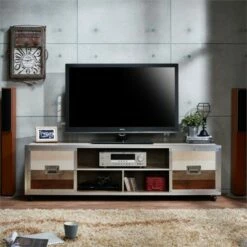 Subtle color and easy mobility make this TV stand in multi-color the perfect choice for conveniently enjoying a family movie or the big game with all your closest friends. Gradient wood like drawer panels with hanging metal handles open to reveal a spacious interior, perfect for storing small media devices, movies or even books and magazines. Set atop caster wheels and complete with a sleek metal frame the Calico 2-drawer TV stand in a multi-color finish can display up to a 70″ TV.Features : CONVENIENT CABLE MANAGEMENT – 2 cut-out holes in the back for cable placementIncludes: One (1) TV StandStyle: ModernFinish: Multi ColorMaterials: MDF, Wood VeneerEasy rear wire accessHolds up to 70 inch TVMobile design with 4-caster wheels3-Open shelves2-DrawersFull extension metal glidesMetal drawer pullsMulti color designEasy to follow step by step assembly guide includedSpecifications : Product Dimensions : 20″H x 70.8″W x 15.7″DProduct Weight : 100 lbsWeight Capacity : 100 lbsAssembly Required : YesWarranty Description : 90-Day Manufacture Limited Replacement Parts Warranty
