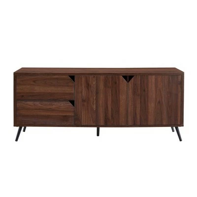 Elegance meets groovy vibes with Saracina Home’s 60″ Mid-Century Modern Closed Storage TV Stand. This entertainment console boasts two drawers and two cabinet doors where you can store remotes, movies, and games out of sight. Cord management ports and two adjustable shelves will keep all your electronics nice and tidy. Telescoping drawer glides and soft-close door hinges keep this TV stand safe from wear and tear. Its angled legs nod to retro influences, while cut-out handles keep the look modern and streamlined for your contemporary living room.
